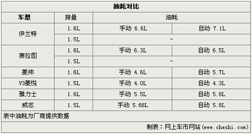 除了在购车时的优惠以外,在日常的使用中,相对小的排量也会在燃油经济性上拥有一定优势。表中可以看出,东南汽车菱帅车型搭载1.6L发动机手动版油耗为4.6,自动版油耗为5.7L,V3菱悦作为代替它的车型,搭载一款1.5L发动机,4.0L/4.3L的平均油耗进步很明显。伊兰特和塞拉图两款车型曾放出消息称会推出搭载1.5L发动机的车型,但因为目前尚未推出,厂商还未能提供有数据。
