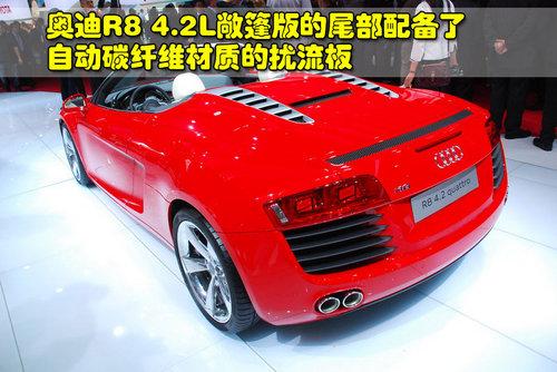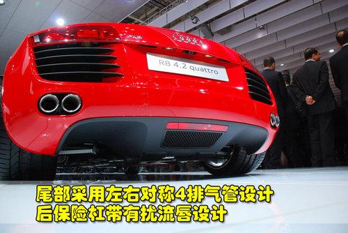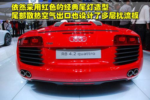 奥迪R8 4.2L敞篷版的尾部配备了自动升级的碳纤维材质扰流板,可以进一步减轻车身自重。这款新车的尾部依然采用红色的经典尾灯造型,而且尾部的散热空气出口也设计了多层扰流板。奥迪R8 4.2L敞篷版尾部采用左右对称的4排气管设计,后保险杠也采用了扰流唇的设计。