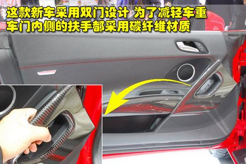 奥迪R8 4.2L敞篷版采用双门开启方式,为了减轻车重,车门内侧的扶手都采用碳纤维材质打造。而且车门的内衬大部分都采用真皮材质包裹,质地非常柔软。车门内侧还设计了储物空间,方便存放比较小的随身物品。