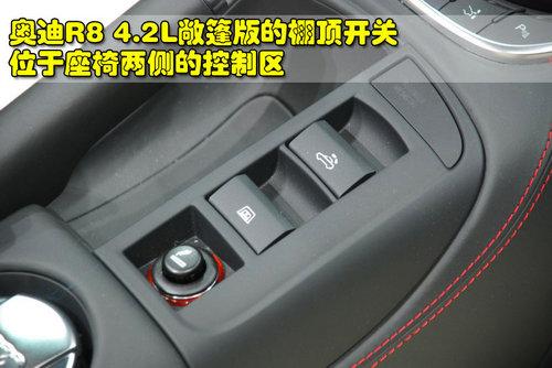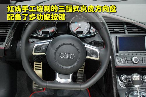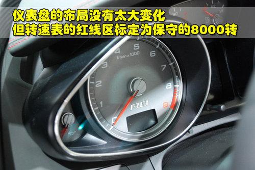 奥迪R8 4.2L敞篷版采用的是红线手工缝制的三幅式真皮方向盘,并且配备了多功能按键。仪表盘的布局与5.2L车型并没有太多变化,但由于引擎动力的减弱,转速表的红线区标定为相对比较保守的8000转。