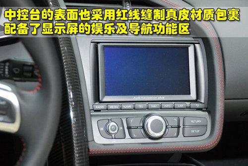 奥迪R8 4.2L敞篷版的中控台周围都采用真皮包裹,并且红线缝制显得运动感更强。中控台两侧都采用了轻量化碳纤维装饰板。中控台顶部配备了大尺寸显示屏,娱乐功能和导航功能都一应俱全。奥迪R8 4.2L敞篷版的顶棚开关位于中央扶手前的位置,独立的设计方便方便驾驶员或操作。