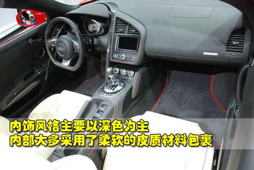奥迪R8 4.2L敞篷版的内饰风格主要以深色调为主,可以很好的突出这款车的运动特征。中控台以及中央扶手等部分大多采用了柔然的皮质材料包裹,不仅看上去显得非常高档,而且也保证了驾乘的舒适性。另外,这款车的内部也有很多细节是采用碳纤维材质。