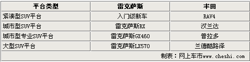 雷克萨斯入门级SUV车型将与丰田紧凑型SUV-RAV4采用同一平台生产,而这种共用平台技术成功的应用在雷克萨斯身上。目前雷克萨斯在国内销售的SUV-RX系列、GX460和LX570车型分别与汉兰达、新普拉多和兰德酷路泽采用相同的技术平台。这类优秀平台技术之间的共用关系不仅有利于汽车市场的发展,而且还可以有效的为公司降低成本。