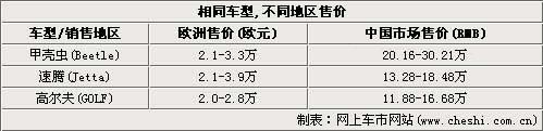 基于大众汽车A级车平台的的甲壳虫、速腾以及高尔夫,在欧洲市场的售价大致都在2到3万欧元,并且售价水平相当。但是在中国市场方面,已经国产的高尔夫6代与速腾的售价大致都在12万元到18万元之间,而甲壳虫的售价却高达20万元以上。即便是2010年大众汽车引进的1.6升甲壳虫的市场定价也在20.16万元。由此可见,车型的国产化对于产品本身的价格回归有着重要的意义。如果未来甲壳虫会在国内正式国产,那么它国产后的价格也理应与速腾、高尔夫处在相同的水平上。