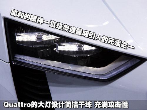 奥迪Quattro概念车的车灯看起来与家族其他车型有点相似,但仔细观察也能看出不少不同。奥迪Quattro概念车的前灯并未采用多镀铬条式设计,简单的四边形车灯搭配两个角度略有不同的车灯,构成了这一双炯炯有神的眼睛,而且是一双充满攻击性的眼睛。