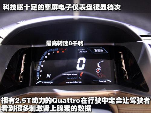 科技感十足的整屏式电子仪表盘是奥迪Quattro概念车的另一大创新,8000转的最高转速向人们显示了他的实力。除了车辆信息,显示屏也同样会显示导航等信息,这也就是为什么中控台如此简洁的原因。