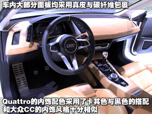 奥迪Quattro概念车的内饰风格与大众CC十分相似,都采用了卡其色和黑色的配色。奥迪Quattro概念车的内饰面板用料基本上仅有两种材料,真皮和碳纤维。