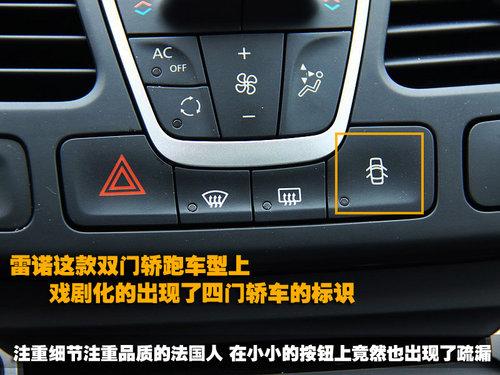 中控门锁的开闭键,在雷诺这款双门轿跑车型上,戏剧化的出现了四门轿车的标识,一向注重细节注重品质的法国人,在这么一个小小的按钮上竟然也疏漏了。