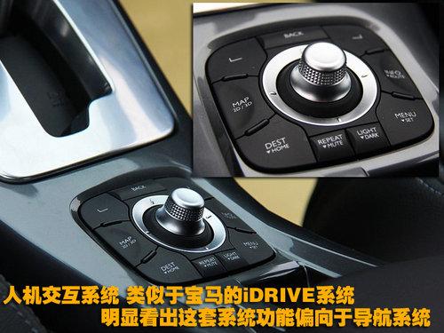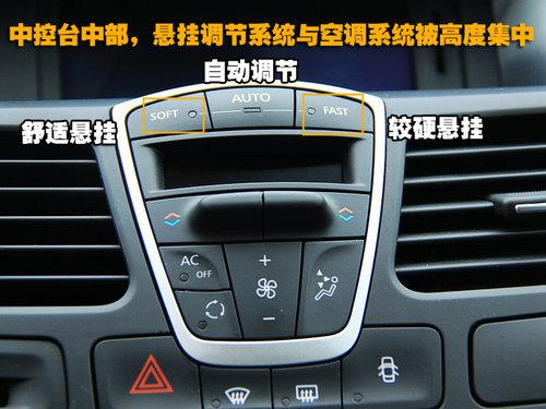 中控台中部,一套悬挂调节系统与空调系统被高度集中在了这里,盾牌型的装饰边框,里面涵盖了悬挂的软硬与自动调节,分区独立空调的设置调节钮,还有空调风力调节,内循环按钮和出风模式调节。在这里要提一句,在按钮满天下的当今汽车设计圈,满眼是按钮的内饰风格似乎让人有些审美疲劳,雷诺拉古那古贝车型上的上下调节钮着实让人眼前有一片新绿。