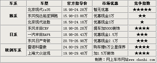通过上表列出了8款比较热销的SUV车型,可以看出,主要竞争对手CRV和ix35 均无优惠,CRV销售方式依然高调,购车需加装饰。其他韩日车系,优惠幅度都在1.5万元以上,其中狮跑和途胜最高优惠高达3万元,另外大众品牌的途观也是供不应求,购车需加1.5万元装饰。权衡哪一款SUV最适合自己、最具性价比,才是消费者最为关注的,下面就详细为大家介绍一下。