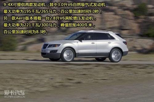 9-4X的动力系统可提供两款发动机,其中3.0升V6自然吸气式发动机最大功率为195千瓦/265马力,百公里加速时间9.0秒,另一款Aero版本搭载一台2.8升V6涡轮增压发动机,最大功率为221千瓦/300马力,峰值扭矩400牛米,百公里加速时间为8.3秒。