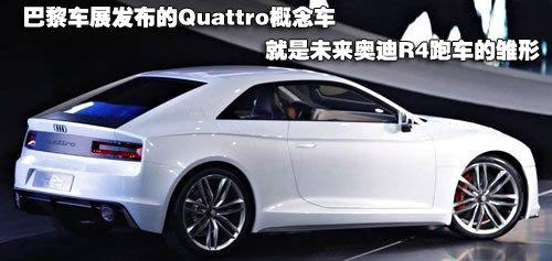 奥迪R4跑车之前一直备受媒体关注,而在巴黎车展中亮相的奥迪Quattro概念车被誉为是奥迪R4跑车的雏形。这一款奥迪为纪念Quattro技术诞生30周年而发布的奥迪Quattro概念车,离我们并不遥远,在巴黎车展上亮相后奥迪Quattro很快将投入量产,奥迪Quattro投产后,相信奥迪R4跑车也将很快的到来。