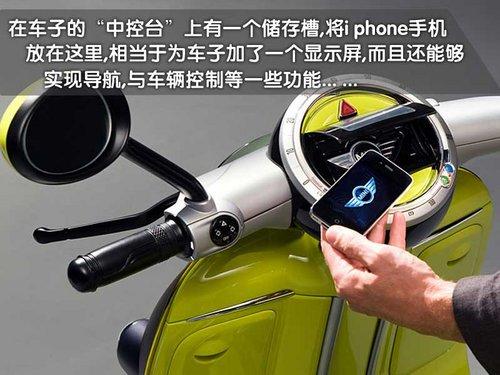 MINI Scooter E概念车将i phone手机与电动车融合,通过位于车辆顶端的专用接口。车主的i phone手机可以放置于其中,与车辆的音响和信息与了系统实现最大化的兼容。此外,还有一项有趣的功能,可以通过谷歌地图来显示其它骑车者的位置,甚至可以发出结伴而行的邀请。