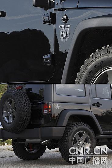Call of Duty:Black Ops特别版以2011式Wrangler Rubicon车型为基础打造,采用高光泽矿灰色(Mineral Gray) 轮圈,搭配32吋越野轮胎与全黑车身涂装,与《使命召唤7:黑色行动》的游戏名称不谋而合。另外,Call of Duty:Black Ops特别版还搭载由改装厂Mapor打造的油箱盖以及尾灯护罩,同时前叶子板上也贴有Call of Duty:Black Ops图样徽饰,右侧车尾也附有星形车身贴纸,让特仕车能够拥有与游戏相同的军装气息。
