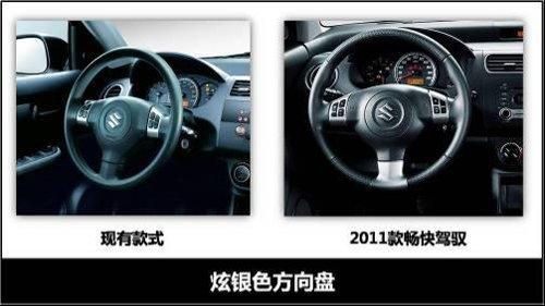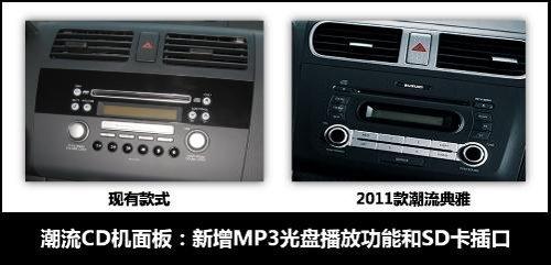 内饰方面,银色成为雨燕2011款内饰的主色调。方向盘采用点状皮纹,真皮触感;经过重新设计的CD面板,按键布局更加合理,按钮与银色按键组合协调。CD还新增了MP3光盘播放功能和SD卡插口,可以播放多种格式音乐。