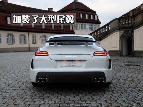 GranGT后部换装了动感十足的包围,多处运用了专业的空气动力学。保时捷品牌英文字母标志和车型标志都不见了踪影,而是贴上了“GranGT”的标志。后备箱顶加装了一个巨型尾翼,原装车型使用的是可伸缩隐藏在车内的尾翼。新的运动排气系统与TechArt稳流器相结合,可自由控制尾排的声浪。
