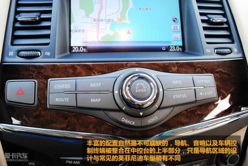 丰富的配置自然是不可或缺的,导航、音响以及车辆控制终端被整合在中控台的上半部分,只是导航区域的设计与常见的英菲尼迪车型稍有不同。除此之外众多豪华配置也一应俱全,比如电通风/加热座椅,电加热方向盘以及电动第三排座椅折叠等等。