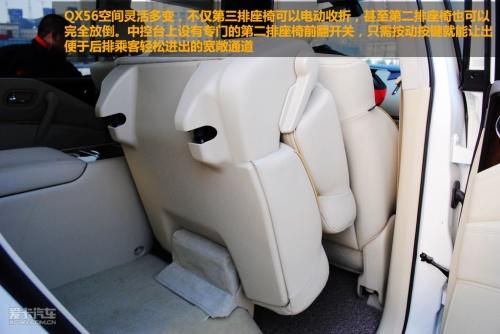 QX56空间灵活多变,不仅第三排座椅可以电动收折,甚至第二排座椅也可以完全放倒。中控台上设有专门的第二排座椅前翻开关,只需按动按键就能让出便于后排乘客轻松进出的宽敞通道,而按60:40分拆的第三排座椅也可电动翻。