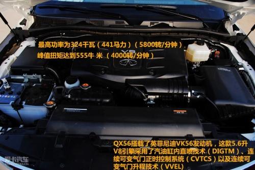 QX56搭载了英菲尼迪VK56发动机,这款5.6升V8引擎采用了汽油缸内直喷技术(DIGTM)、连续可变气门正时控制系统(CVTCS)以及连续可变气门升程技术(VVEL)。VVEL与CVTCS技术的运用使得引擎气门的开启角度与时机得以实现智能全时调节,使得这款发动机的最高功率为324千瓦(441马力)(5800转/分钟),峰值扭矩达到555牛·米 (4000转/分钟)。