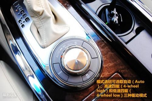 QX56配有英菲尼迪特有的智能全模式四驱系统(All-Mode 4WD),通过车内的模式选钮可选取自动(Auto)、高速四驱(4-wheel high)和低速四驱(4-wheel low)三种驱动模式,以保证城市驾驶的经济性并主动帮助驾驶者从容应对多变路况。
