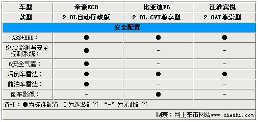 由于没有配备过多科技含量较高的被动安全配置,三款车在安全方面做得只能算及格。其中表现比较出色的仍然是帝豪EC8,除了ABS+EBD、倒车雷达等基本安全配置外,帝豪EC8还配备两探头式前泊车雷达,这样的配置在10万出头的价位十分罕见。不过比亚迪F6配备了倒车影像,独树一帜的贴心配置让F6有所加分。
