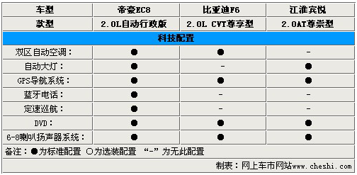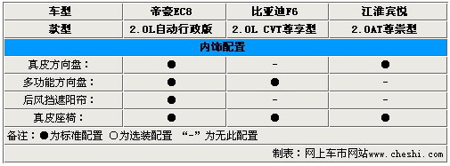 内部配置方面,三款车均为使用者提供了真皮座椅。而帝豪EC8和江淮宾悦还为使用者提供了真皮方向盘,但是比亚迪F6提供的方向盘多功能按键或多或少弥补了一些不足。三款车仅有帝豪EC8配备了后风挡遮阳帘,既不会让后排乘客被晒到,也增加了后排乘客的私密性。