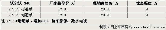 由北京海之沃,沃尔沃授权经销商独家买断的15台S40轿车,是配备了2.5升直列5缸涡轮增压动力的车型。厂家基础价为37.8万,其中5台车型的售价为28.8万直降9万元;另外10台在原车型基础上增加GPS、倒车影像、数字电视功能,售价29.98万。