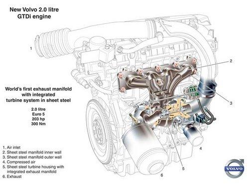 全新2.0升GTDi缸内直喷涡轮增压汽油引擎,涡轮本体部份由Volvo、Borg-Warner Turbo System以及钢材制造商Benteler Automotive所共同研发而成。代号K03的增压涡轮,是目前市面上同马力级距引擎中体积最轻巧者。有别于传统设计,全新2.0 GTDi引擎将涡轮本体与排气歧管整合为一体设计;同时材质上也采用片状钢材打造,而非常见的铸造方式。