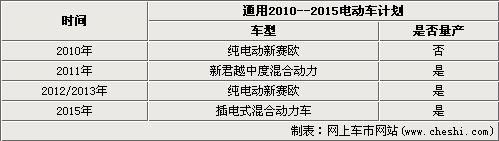 在2010年年底,上海通用汽车将首先发布新赛欧的纯电动车样车;2011年在中高级汽车市场上拥有较高占有率的全新君越轿车,将会推出一款中度混合动力版车型;2013年新赛欧的纯电动车版将正式量产;2015年上海通用汽车将正式量产插电式混合动力车型。