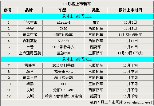 据了解,已经确定推出的6款车型中,丰田Alphard采取先进口再国产的方式进入,CX20跨界小车将在昆明上市,吉普将在11月12日推出2011款牧马人。而东风裕隆纯电动轿车是以概念车的形式在11月5日在深圳全球首发,上汽通用五菱宝骏630将于11月18日正式下线。未确定具体上市新车中,仅有华泰B11为全新车型,其他5款为改款或新增排量推新车。