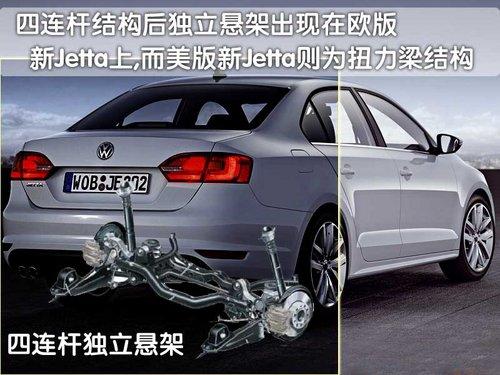 欧洲版新Jetta与美版车型在外形上只有细节的差异但底盘结构却完全不同。美版新一代捷达并没有沿用高尔夫6代的四连杆独立悬架底盘,而是采用了半独立扭力梁式悬架结构。对于这一点,相信开过速腾、高尔夫A6的朋友都知道,大众从PQ35平台开始针对A级紧凑型轿车使用的独立悬架,在舒适性和操控性上都要比PQ34平台的扭力梁结构半独立悬架更具优势。