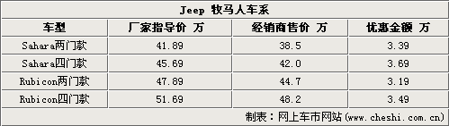 同时经销商也推荐潜在客户关注目前销售的老款牧马人车型,从车型款式到颜色上都非常齐全,并且在实际售价上老款牧马人的优惠均在3.19万元以上,其中优惠最大的Sahara四门版车款在厂家指导价基础上直接优惠3.69万元。牧马人车系的入门车款两门版Sshara售价仅为38.5万元。