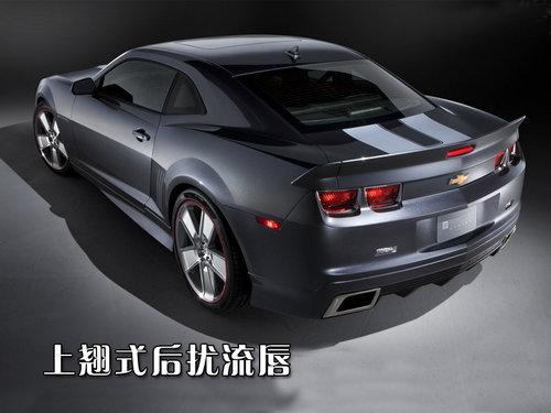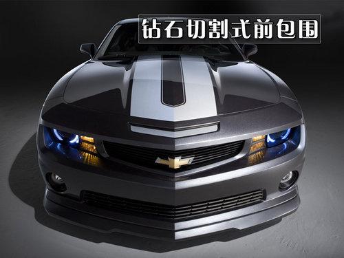 这辆特别版卡玛洛基于2010款的卡玛洛SS改装而来,车身整体采用低调的银灰色喷漆,引擎盖中间喷有银色的赛道纹。外形依旧是典型的美式肌肉车风格,前氙气大灯外围加装了蓝色冷光天使眼。新的前包围采用钻石切割式的棱角,更具进攻性。