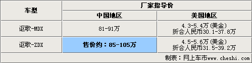 讴歌SUV车型MDX和讴歌跨界车ZDX同属于一个级别的车型,它们的轴距都是2750mm。但是讴歌ZDX的车身要比MDX长,而身高度则低于MDX,这样的设计完全符合跨界车(运动型多功能跑车)的定位。目前讴歌MDX在中国地区的售价为81-91万,通过讴歌MDX在美国地区的售价,我们预计讴歌ZDX引入中国地区的售价约为85-105万(讴歌ZDX目前美国地区的指导价为4.5-5.6万美金,折合人民币为31.5-39.2万元)。