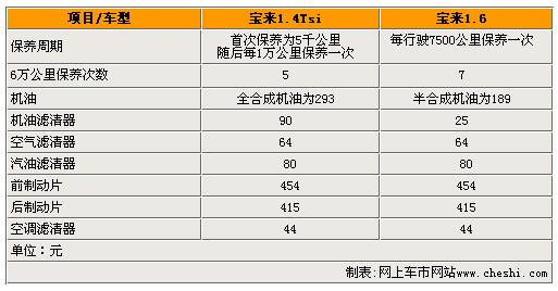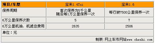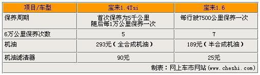 宝来1.4T与宝来1.6在保养方面的不同主要在于保养周期不一样,根据4S店有关技术人员表示宝来1.4T首保为5000公里一保养,往后是1万公里一保养,宝来1.6为均匀的7500公里一保养。这样算下来的话,两辆车共以跑6万公里计算,1.4T车型和1.6自然进气车型分别进4S店的次数为5次与7次,每次保养都有机油滤清器与机油不同而产生的差价。