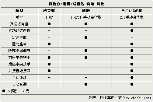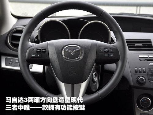 舒适配置的部分,新马自达3两厢再胜一筹。除了定速巡航以外,其他部分的配置非常全面,这点对得起其进口车的身份。科鲁兹和速腾在配置部分各有优势,前者更侧重于细节的运动感觉,后者则是以方面舒服为出发点。