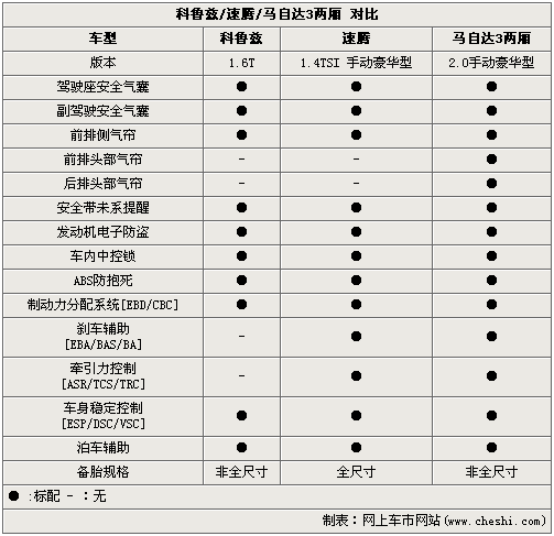 既要跑得快,又要够安心,这都是一款成功的车型所必须具备的要素。安全部分新马自达3两厢版以非常明显的优势胜出,前后排侧向安全气帘、刹车辅助系统以及牵引力控制系统等部分都是其优势所在。速腾输在了安全气囊,科鲁兹尽管加入了ESC车身电子稳定系统,但却不能完全弥补其他部分的不足。
