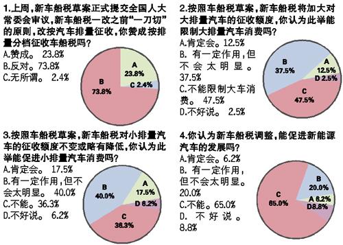 问卷同时对“新的草案中新车船税将加大对大排量汽车的征收额度,你认为此举能限制大排量汽车消费吗”这个问题进行了调查,结果显示,接近半数的消费者(47.5%)表示此举对限制大排量汽车的消费影响不大,另外还有37.5%的消费者也表示此举就算对大排量车的消费“有一定限制作用,但也不会太明显”,比例相当之高,相比之下,仅有12.5%的消费者表示此举能限制大排量汽车的消费。
