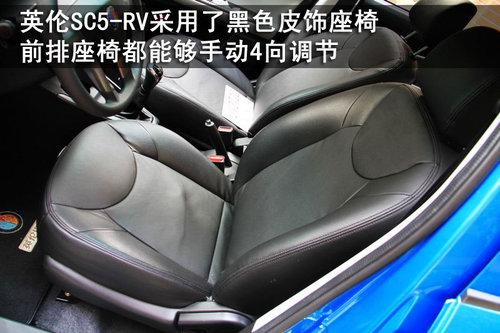 英伦SC5-RV的高配车型整车座椅均采用皮饰包裹,厚实的椅垫和椅背的填充物确保了驾乘舒适性。前排两个座椅的前后、靠背角度均为手动调节,副驾驶座椅的下方还有一个抽屉,更加方便爱美的女性车主放置高跟鞋。