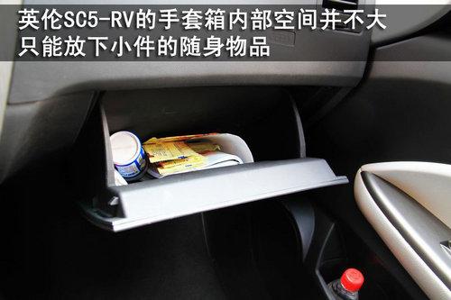 英伦SC5-RV的中控台下方设计了两个杯托,但空间非常狭窄,只能放下小瓶的饮用水和饮料。而副驾驶的手套箱内部空间也并不大,只能放下小件的随身物品。但英伦SC5-RV的四个车门内侧都设计了储物空间,实用性还是非常不错的。
