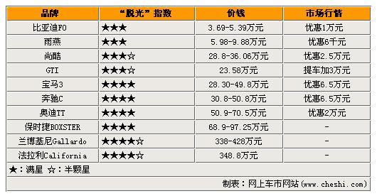 通过上表大家可以看出,今天小编为大家介绍了不同价位的车。比亚迪F0、雨燕小巧可爱,一直是那些可爱型女孩的最佳首选。尚酷、GTI不仅外观时尚还有很强劲的动力输出,是那些喜欢时尚个性女生的最爱。宝马3系、奔驰C级轿车动力输出猛,乘坐舒适,外观稳重,非常适合传统并且崇尚高品味的女性。奥迪TT、保时捷BoxSter外形张扬,爆发性强,是那些闷骚女性一直追崇的车型。超级跑车兰博基尼Gallardo、法拉利California外形动感,动力爆发性极强,时尚并且价钱昂贵,不用多说一定是那些拜金女性的最爱。