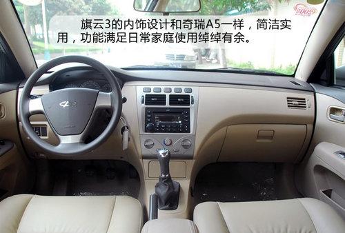 坐进旗云3的内部,可以发现布局和颜色和奇瑞A5是相同的,可以看到整个中控台的设计十分简洁,布局清晰,每一个功能都划分得清晰明了,这样的设计已经透露了它开始更加纯粹的走实用主义的设计方向。