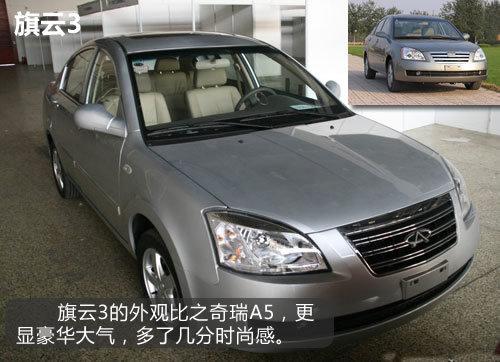 旗云3则是奇瑞A5的改款车型,变化稍微明显一些:4条粗大的镀铬条变为了两辐式,看上去更美观和时尚;尾部的三角形尾灯也变为了“天籁式”,虽然有点模仿嫌疑吧,但是总比老款的好看多了。