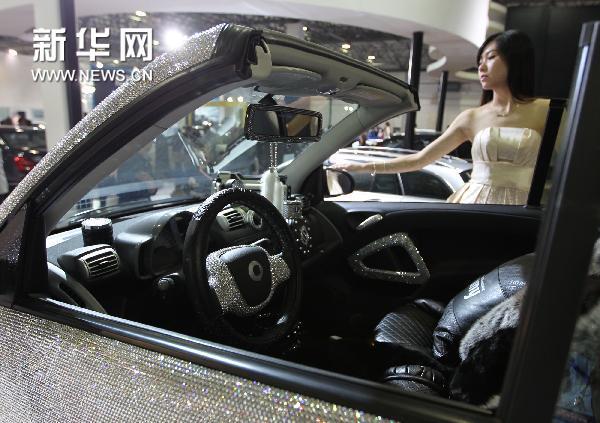 11月11日,在第四届温州汽车博览会上,模特展示一辆周身镶满水晶钻的敞篷汽车。这辆汽车镶嵌了283960颗施华洛世奇水晶钻,由车主公司的5名员工花了3个月时间手工完成。据介绍,购买这些水晶钻的花费在40万元左右。(郑鹏 摄)