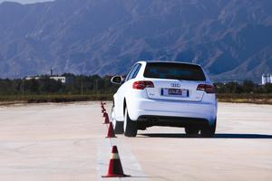 另外一个颇为令人头痛的问题是,它的每次加速测试成绩相差不大,或许唯独能对测试数据产生影响的就只有测试场地的风速和风向了。根据厂方公布的数字,A3 Sportback 1.8 TFSI从静止加速到100公里/小时的成绩为7.7秒,显然奥迪的官方说法有些保守,我们的每一次测试结果都要好于这一成绩。综合场地因素,这辆车的0-100公里/小时加速成绩被修正为7.58秒,完成0-400米加速过程用时15.55秒,尾速止于145公里/小时。结束加速测试环节之后,我开始绕场行驶,以此来对制动系统进行散热,接下来的项目对A3 Sportback来说是一个不小的挑战。