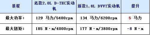 老款景程使用的是一款直列四缸的2.0L发动机,最大功率只有129马力(95kW),最大扭矩为185牛米,对于一款2.0L的发动机来说,这样的数据确实有些不理想。而2010款景程更换了科鲁兹的1.8L DVVT发动机,其采用Ecotec技术,最大功率达到134马力,最大扭矩为177牛米。在排量降低的情况下仍实现了最大功率的反超。