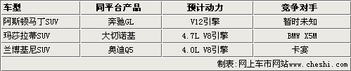 阿斯顿马丁是以奔驰GL平台为基础,打造了Lagonda概念SUV,这款全新产品曾经在海外车展上亮相过,这款新车有望搭载全新的V12引擎,目前还不清楚这款车的具体动力情况。而玛莎拉蒂推出的跨界SUV车型将基于吉普的大切诺基平台,很可能会搭载玛莎拉蒂GT的4.7L V8引擎,竞争对手将瞄准BMW X5M这种运动型SUV。而兰博基尼的SUV将在奥迪Q5的平台上打造,双涡轮增压的4.0L V8引擎将是最好的匹配选择。