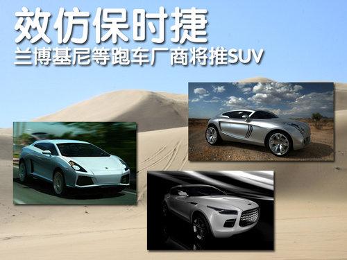 保时捷卡宴取得的成功足以让兰博基尼、玛莎拉蒂等跑车厂商眼红,不过这些超级跑车品牌也并没闲着,都在酝酿着SUV的计划,希望能分得保时捷的一勺羹。很早之前,阿斯顿马丁和玛莎拉蒂就传出了SUV产品的计划,并且其中有的车型已经亮相过,而兰博基尼也计划着推出一款豪华SUV车型,预计将在2012年正式亮相。