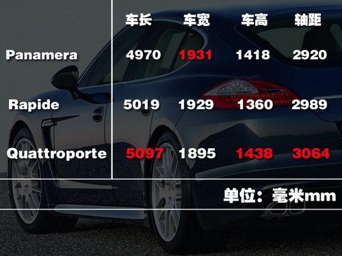 通过对三款车的尺寸进行对比,我们可以很清楚的看出,更偏向商务用途的玛莎拉蒂总裁在车长、车高和轴距方面优势显著,而保时捷panamera则在车宽方面有着独特的优势。而最注重跑车原始性能的阿斯顿马丁Rapide,各方面都略微处于劣势,在空间方面恐怕并不会表现的有多出色。