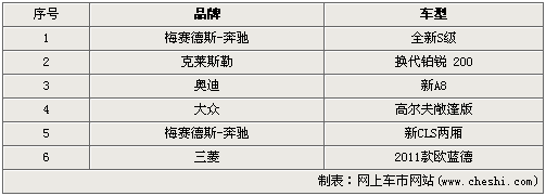 本周六款新车在海外爆出新闻,其中两款车型来自豪华车品牌梅赛德斯-奔驰,车型分别是全新S级和新CLS两厢版。前者的重点在于2013年发布,而后者则是爆出2011年量产的好消息。在国内动静轻微的克莱斯勒品牌将推200车型,垂直换代现款铂锐。同为欧洲豪华车品牌的奥迪,近日宣布新A8搭载四缸混动发动机的消息。对应宝马1系敞篷,大众在2011年将推出敞篷版高尔夫6。2011款欧蓝德可谓是最没有悬念,年度小改款改变不大。
